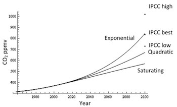 The projection the IPCC uses is NOT based on physics. It is an extrapolation of the CO2 rise trend which results from burning fossil fuels and deforestation. They fancy it up with the Bern carbon cycle model but end up with exactly a simple exponential equation as a fit to the data. No real physics in spite of the window dressing they give it. Hope this clarifies the point of the paper.