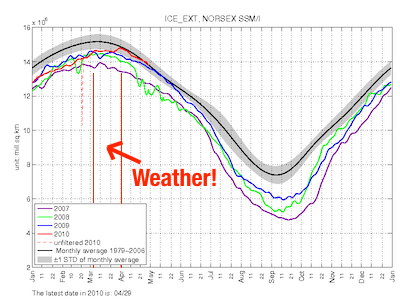 What’s actually happening is that the 2010 sea ice extent has tracked previous “low” years until an early March cold snap in the Bering Sea delayed the onset of retreat. After that delay, it’s right back on the same trajectory.