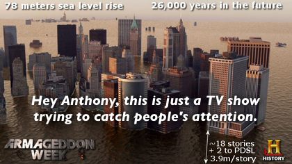 “Freaking out about NYC sea level rise is easy to do when you don’t pay attention to history“. This is funny. Anthony Watts talking about “paying attention”! Apparently he’s seen some photoshopped what-if visuals on the History Channel that he thinks prove that climate scientists are liars and that the “mainstream media” is in on it too. Further more that we can adapt to anything, including Global Warming (which isn’t happening).