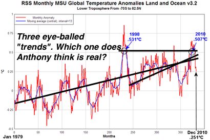 So what was “the warmest year” in Anthony’s preferred dataset? Yes, 1998, the outlier year with a massive El Niño boost which has been the denialist “trick” for several years because it throws off short-term statistical significance. Look for this talking point to be quietly dropped over the year as moment