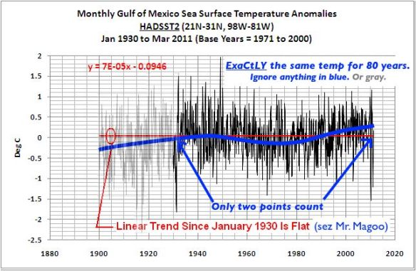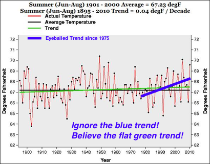 “Pat Frank: The New Science of Climate Change“ (May 14, 2011). Anthony Watts’ blog buddy “John A” wants us to read chemistry PhD Pat Frank’s May 6th post on Jeff Id’s blog (ah, “social networking”). It proves that Global Warming is all just fiddling by them dang lyin’ climate scientists. They adjusted the early 20th century surface temperatures upwards to create the appearance of a late-century warming trend! What sneaks.
